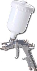 Sucção (caneca inferior) – É o equipamento mais comum e de fácil regulagem, o ar passa pelo corpo da pistola e puxa a tinta para o bico.